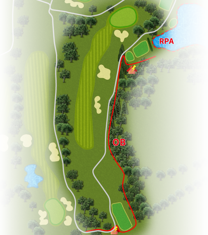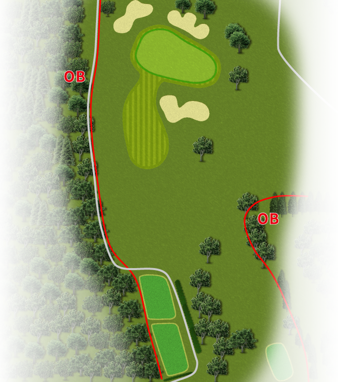 FW右側は、O.Bが続いている。ドライバーの狙いは左サイド。2打目は打ち下ろし。ピンがバンカー越えでも花道から攻めるのが安全策。