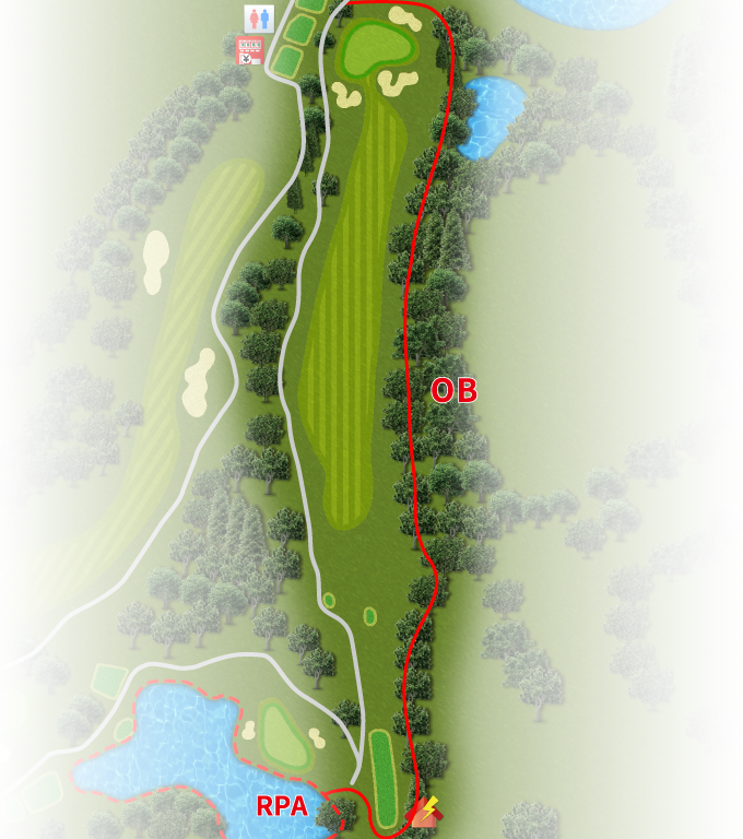 距離のないロング。しかし右にドッグレッグしているのでセカンドショットのクラブに注意。刻んで3オン狙い。